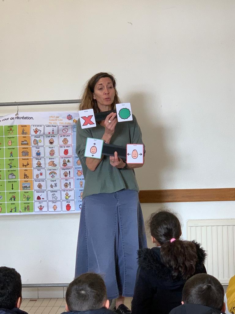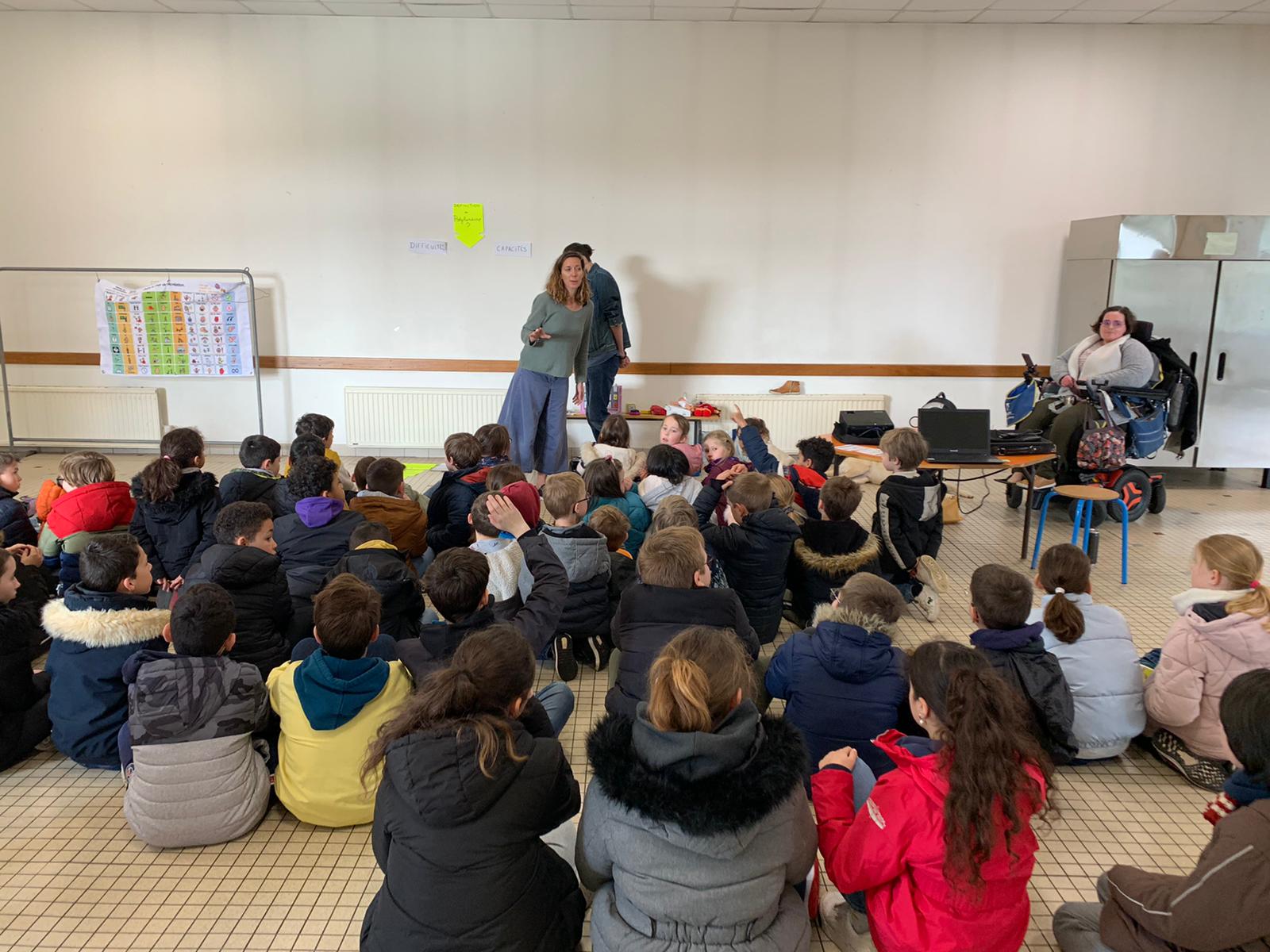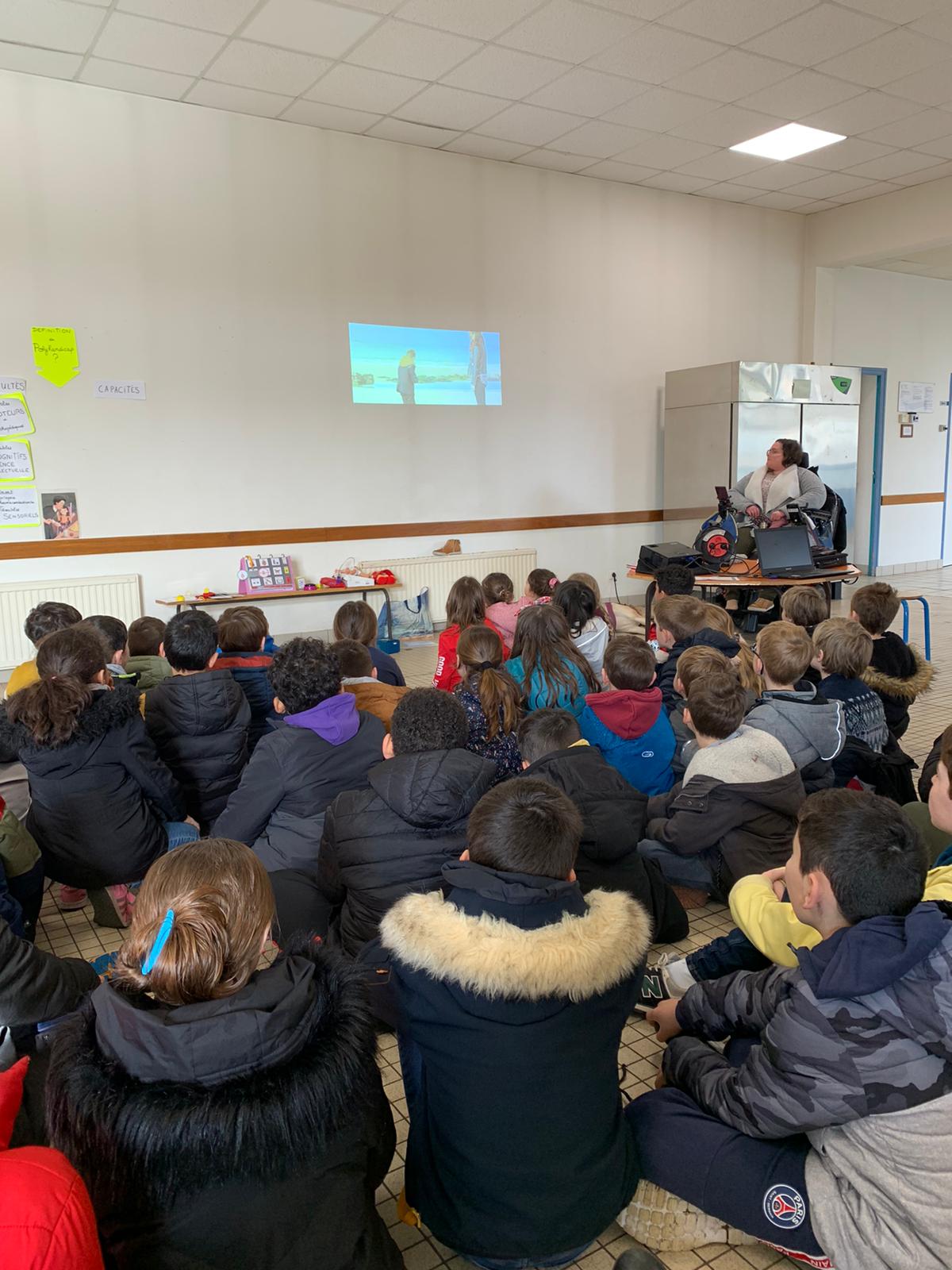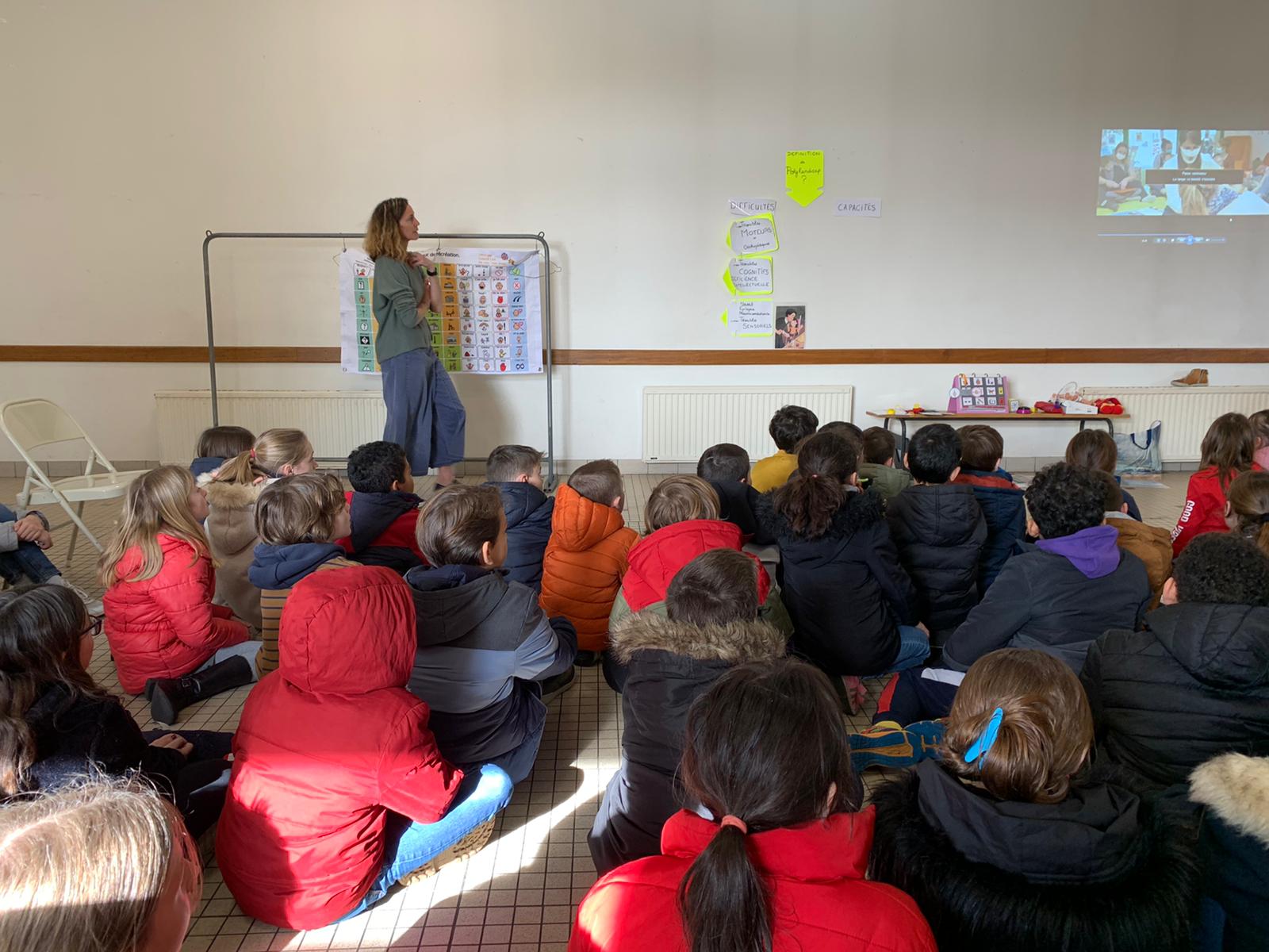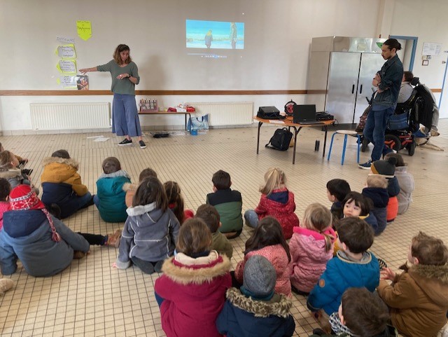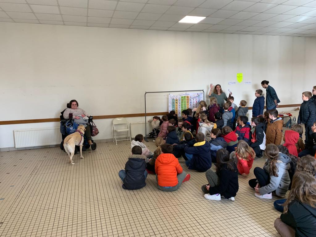Les membres de l’association “Des carrés dans des ronds” sont venus présenter le polyhandicap aux élèves. Emmanuelle, l’éducatrice, était accompagnée de Titouan, Auregan et Passoa. Les élèves ont découvert que les enfants porteurs de polyhandicap pouvaient apprendre et communiquer avec leurs yeux grâce à du matériel adapté dont l’achat est financé grâce aux dons. Le vendredi 7 avril, nous organiserons un pique-nique solidaire afin de collecter des fonds pour qu’ils puissent continuer de scolariser des enfants dans de bonnes conditions. Les enfants étaient contents de revoir Auregan et Passoa qui étaient venues présenter l’association Handi’chiens l’an dernier.