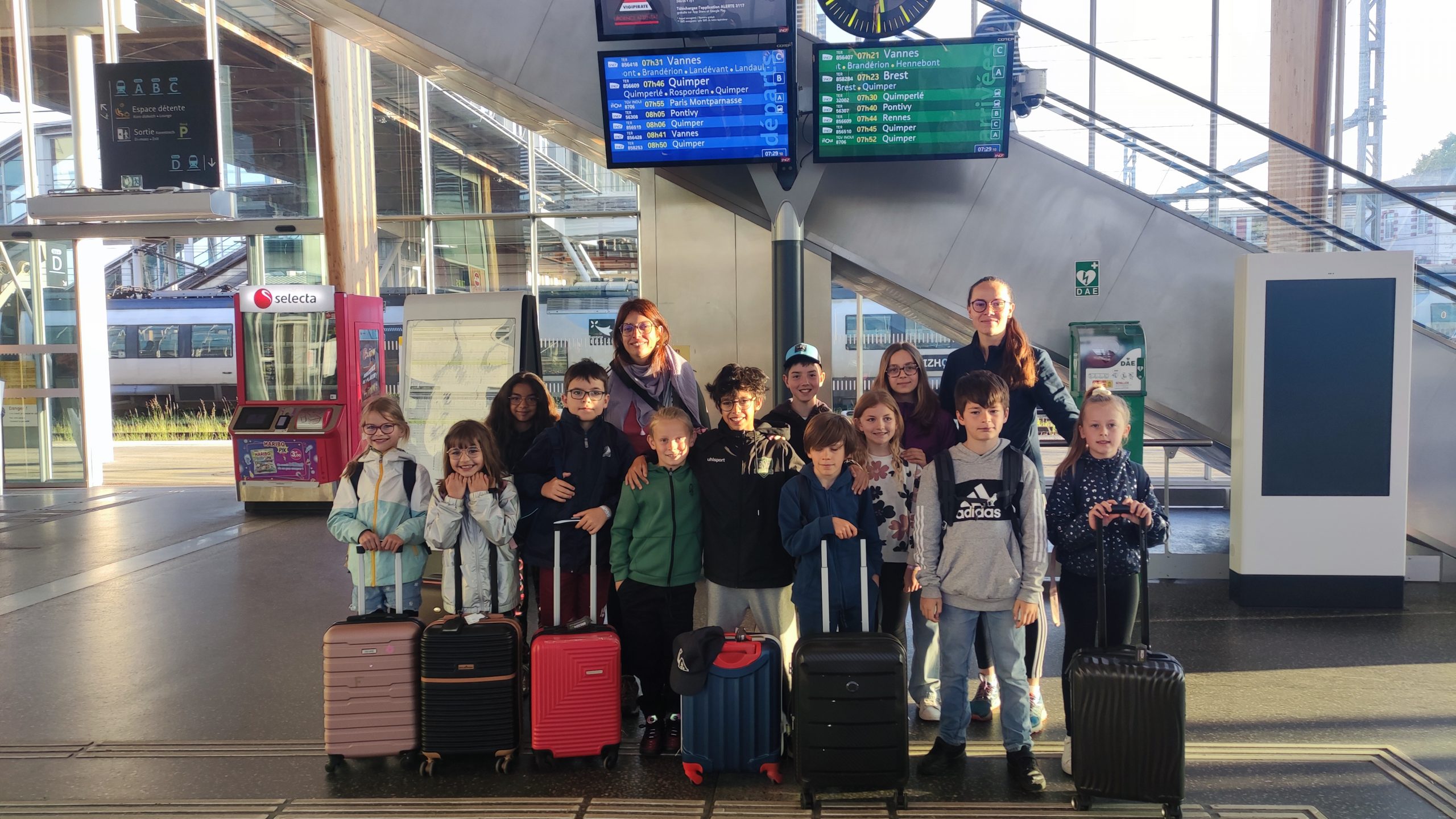 Lundi 19 mai 2025, 12 élèves du CE2 au CM2 de l’Ecole Saint Gilles d’Hennebont, accompagnés de deux enseignantes, Sylvie Martin et Marie Etienne, ont embarqué à bord d’un TGV direction Kehl, en Allemagne. Ils y passeront 3 jours sur place, accueillis par l’Ecole Falkenhausenschule de Kehl dans le cadre d’un projet Erasmus. Au programme, visite de l’école, participation à des cours, jeux coopératifs avec les élèves Allemands, sortie en Forêt Noire, luge d’été, …