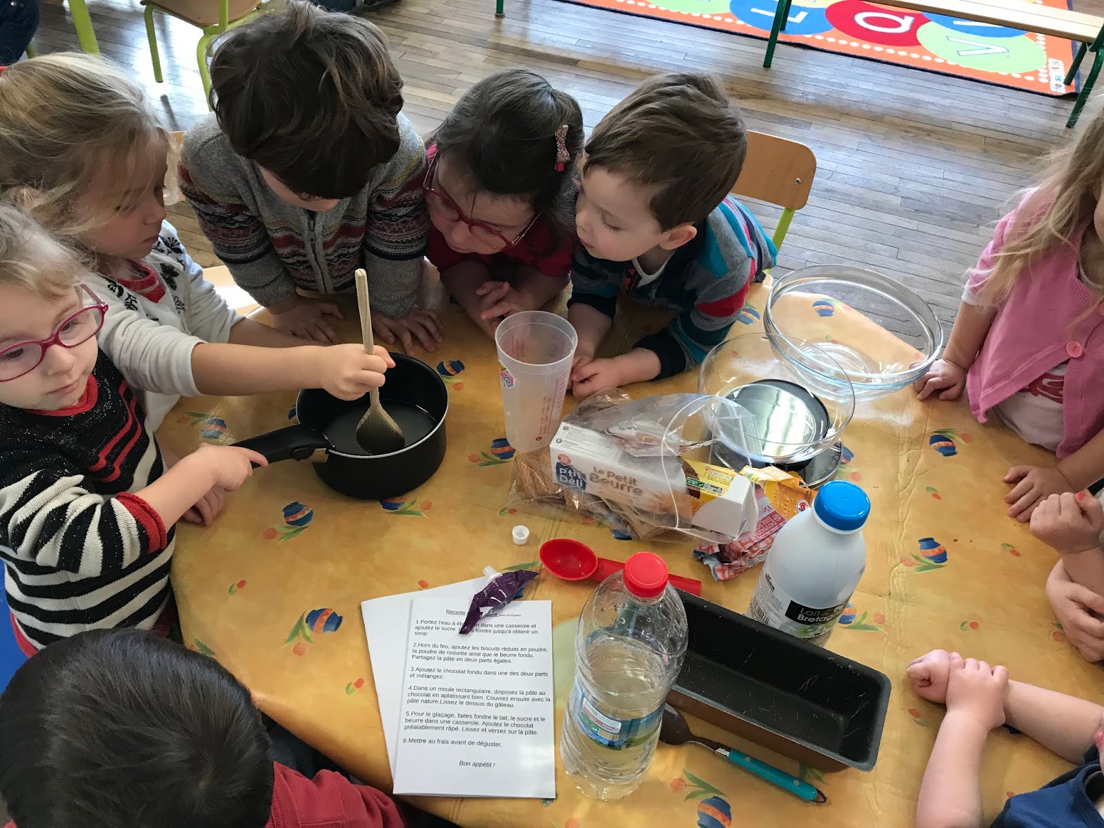 Pendant la semaine de la Croatie, les PS/MS bilingues ont cuisiné un gâteau croate, le Bajadera. Pour faire le gâteau nous avons mélangé du sucre, du beurre, des biscuits, de la poudre de noisette et du chocolat.