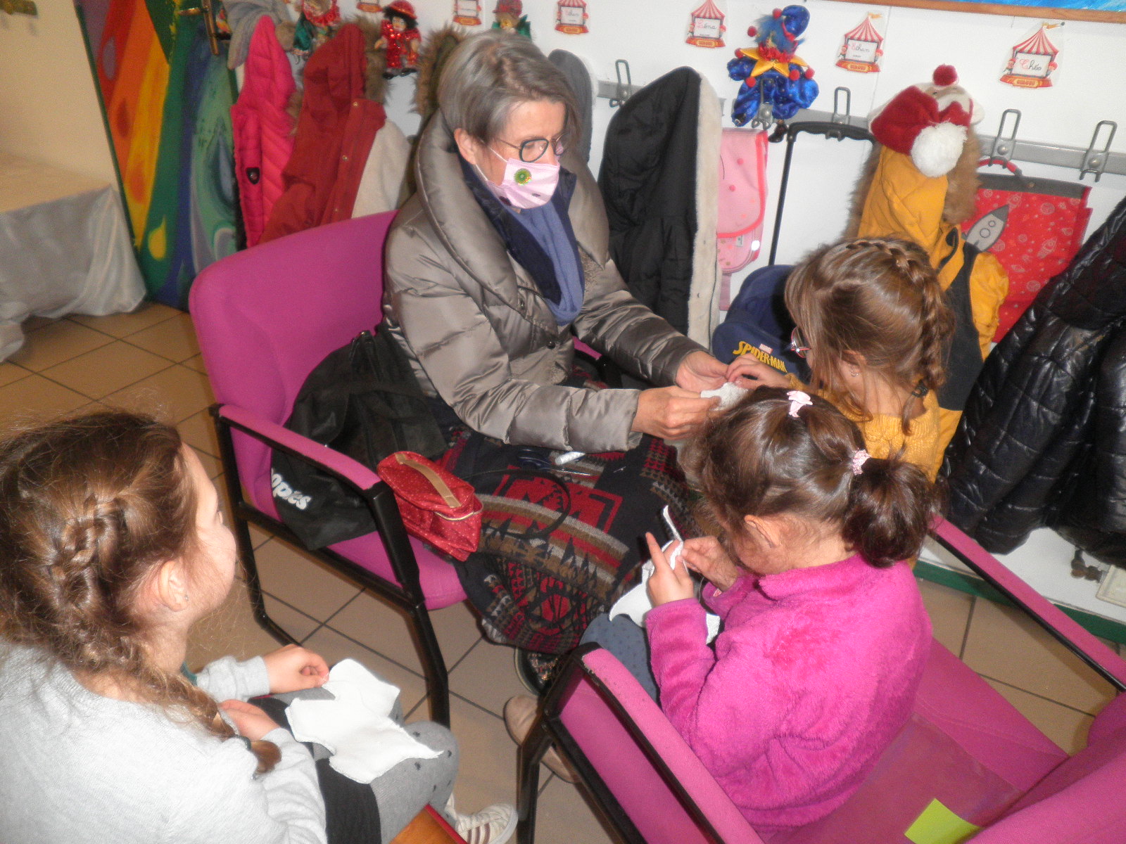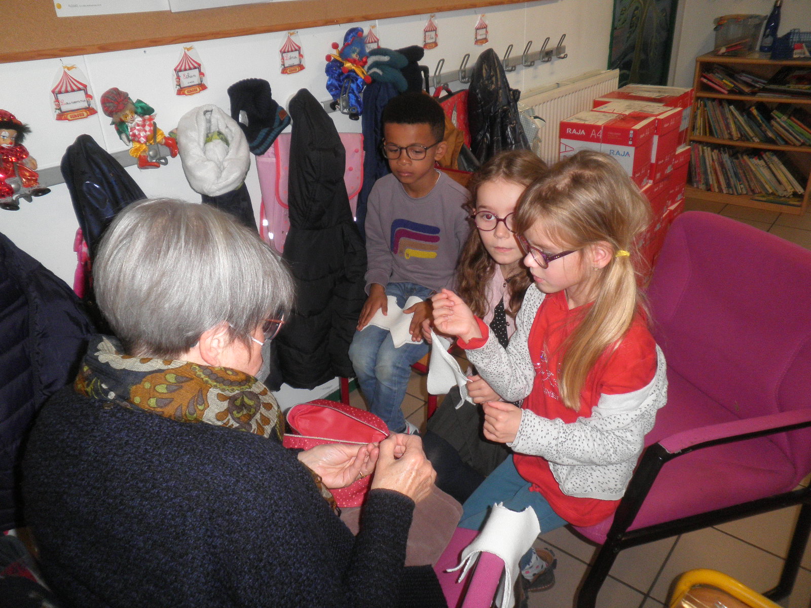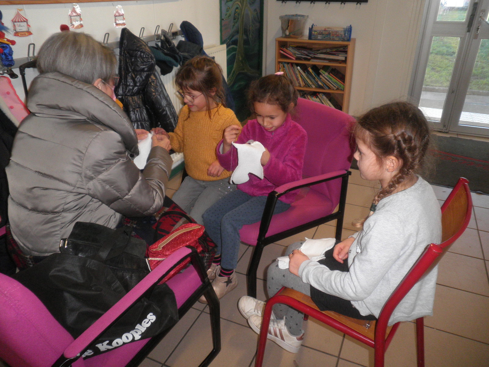 Depuis les vacances de la Toussaint, Claudine Groix vient tous les vendredis après-midi auprès des CP pour faire de la lecture et de la couture. Elle est attendue avec impatience !
