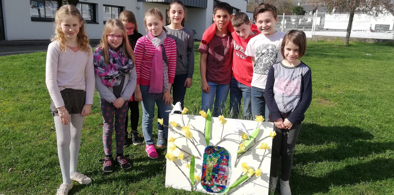 Pour la messe des familles de l’école et de celle de Brandérion qui avait lieu à l’église de Saint Gilles, nous avons confectionné un tableau avec des fleurs en papier et un vitrail.